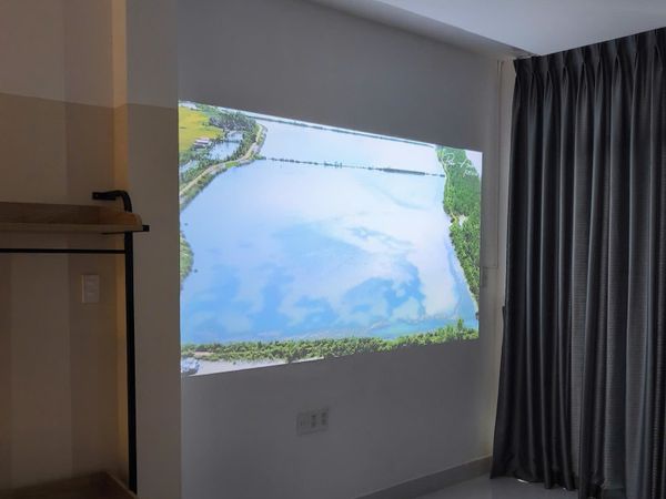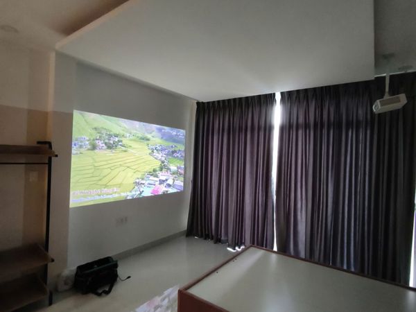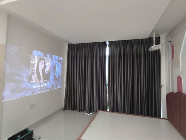 Hệ thống phòng của Homestay này khá nhỏ và được thiết kế theo hướng tối giản, tone màu chủ đạo là màu trắng, ưu điểm của dạng phòng thế này là có thể sử dụng máy chiếu chiếu thẳng lên tường mà không cần sử dụng đến màn chiếu, có thể giúp của Homestay tiết kiệm được 1 khoản chi phí khá đáng kể. Thêm vào đó, kích thước phòng không quá lớn cũng như có hệ thống rèm che ở các cửa sổ nên Xview Xcine4 Pro2 hoàn toàn có thể cân được không gian này.